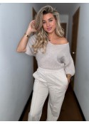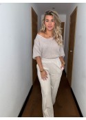 De broek is gedetailleerd met een elastieke taille band, wijde rechte pijpen en steekzakken.