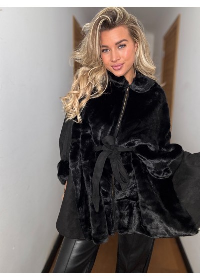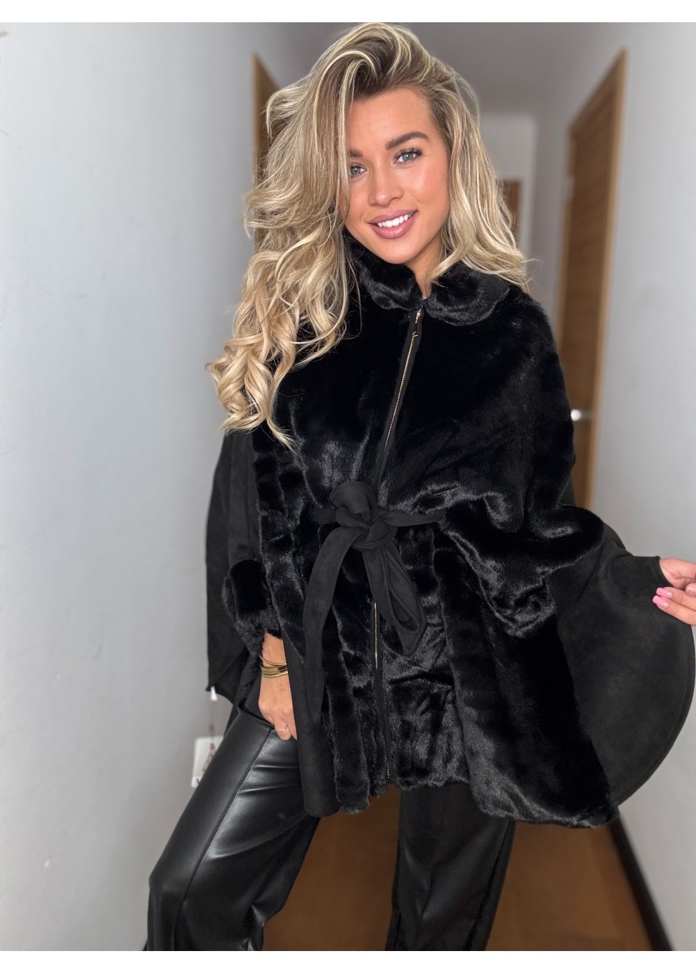 De cape heeft een hoge hals en twee splitten aan de zijkant.