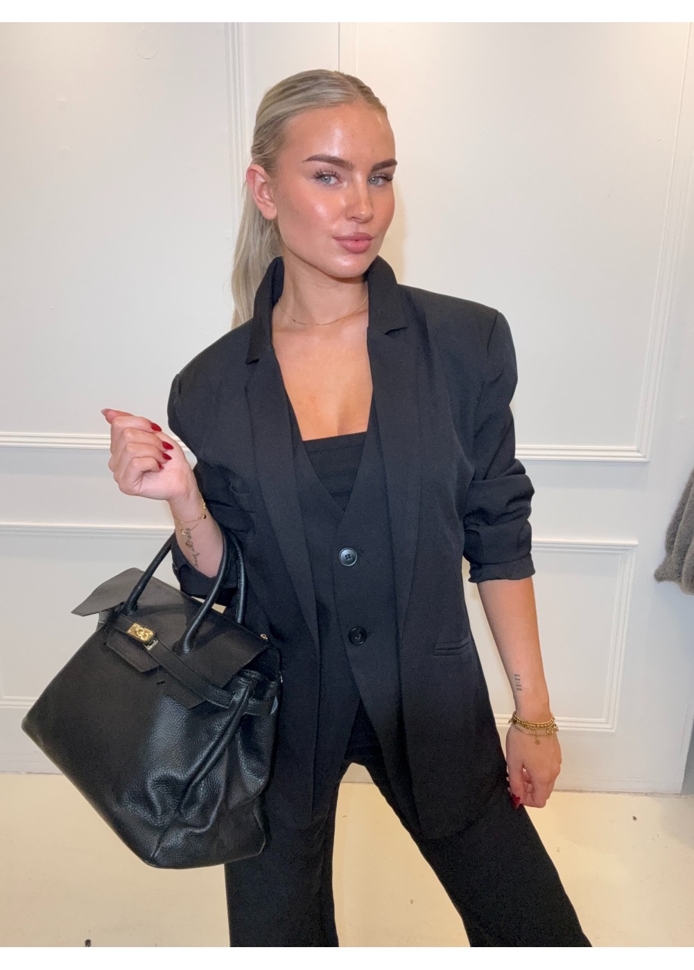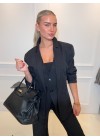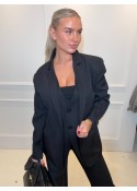 De blazer is gedetailleerd met een kraag, schoudervulling,