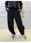 De broek heeft wijde pijpen, riem lussen en steekzakken.