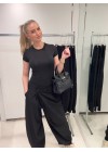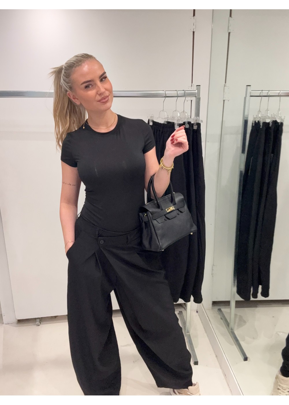 De broek heeft lange wijde pijpen, elastiek aan de achterkant, riem lussen en steekzakken.
