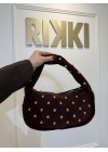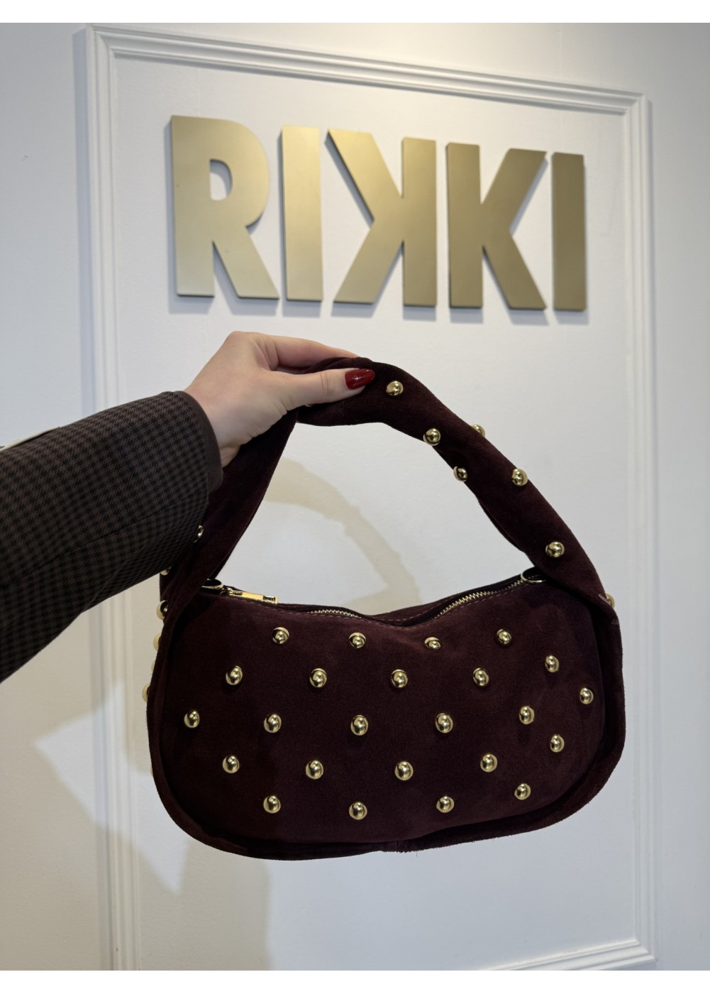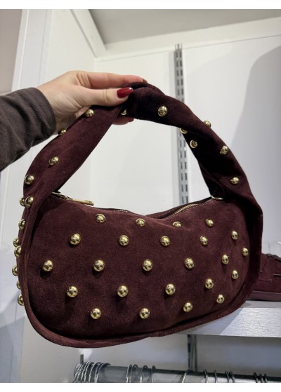 De tas heeft een rechthoekige vorm van suede en gouden studs.