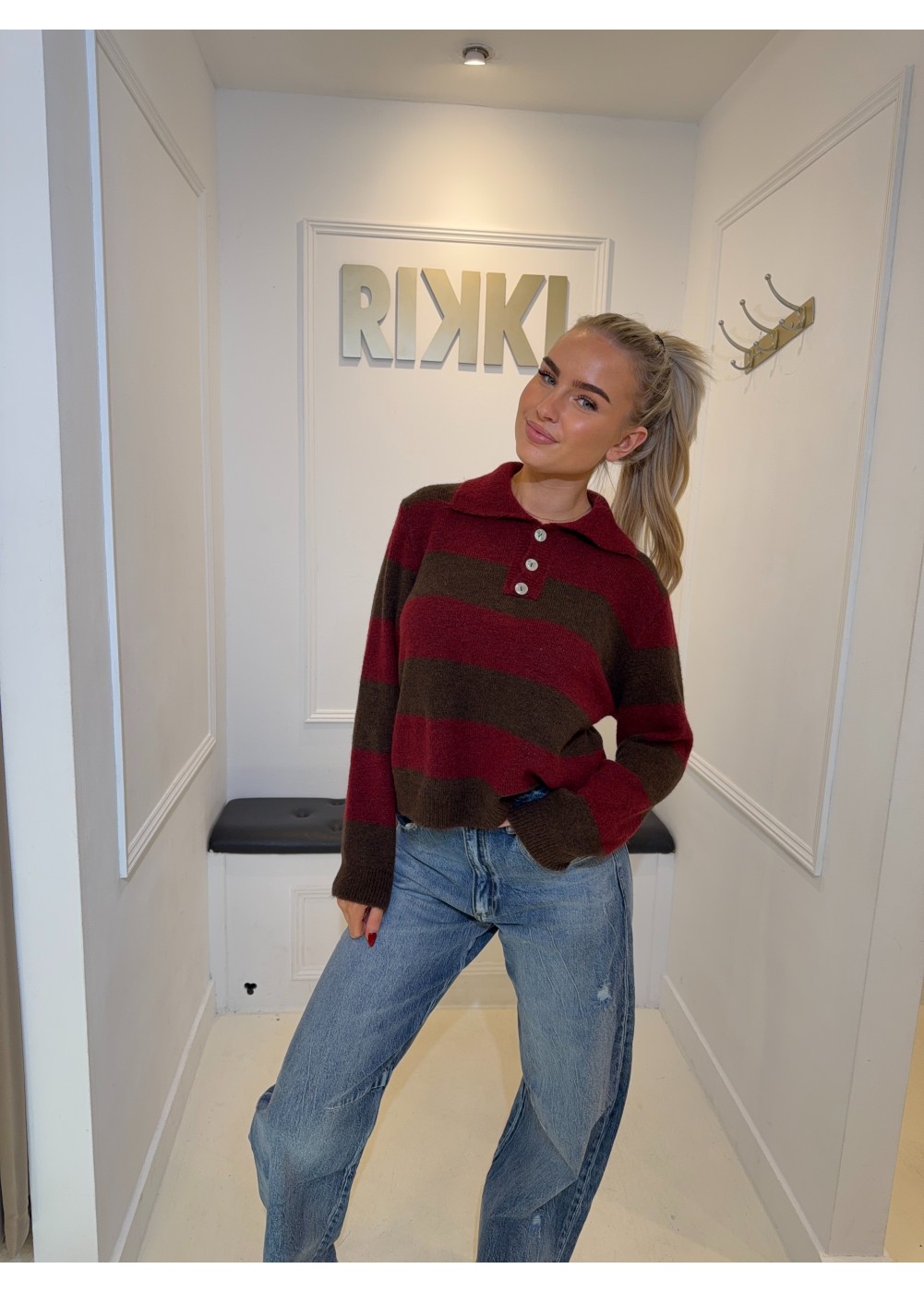 De trui heeft een kraag en lange mouwen.