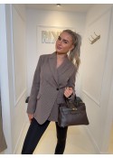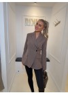 De blazer sluit d.m.v een schuine knoop.