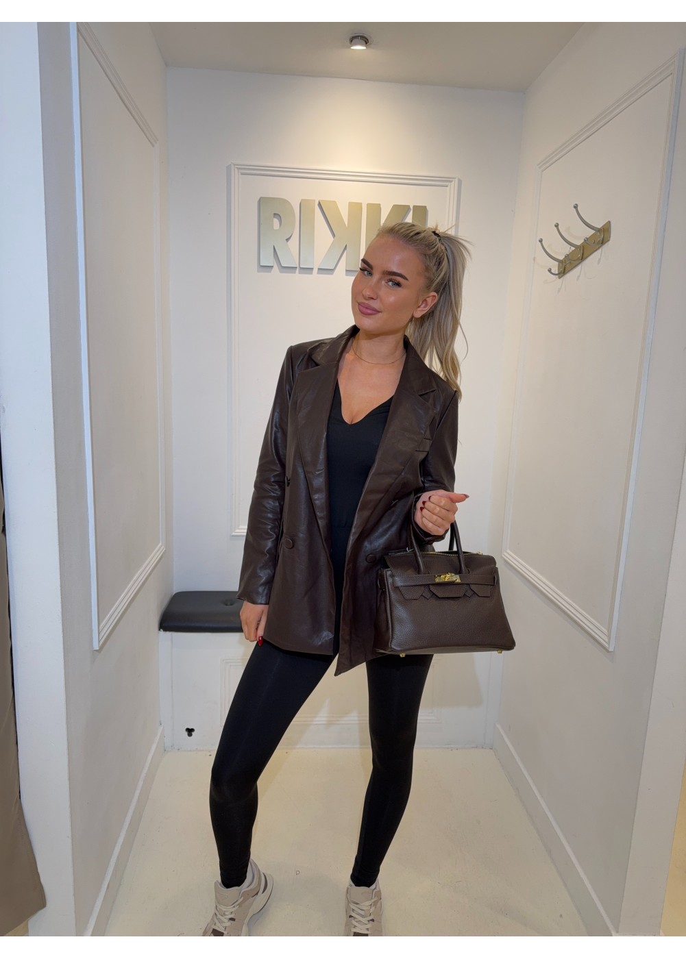 De blazer heeft een kraag, lange mouwen en twee opgestikte zakken.