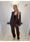 De broek heeft rechte pijpen, riem lussen en steekzakken.