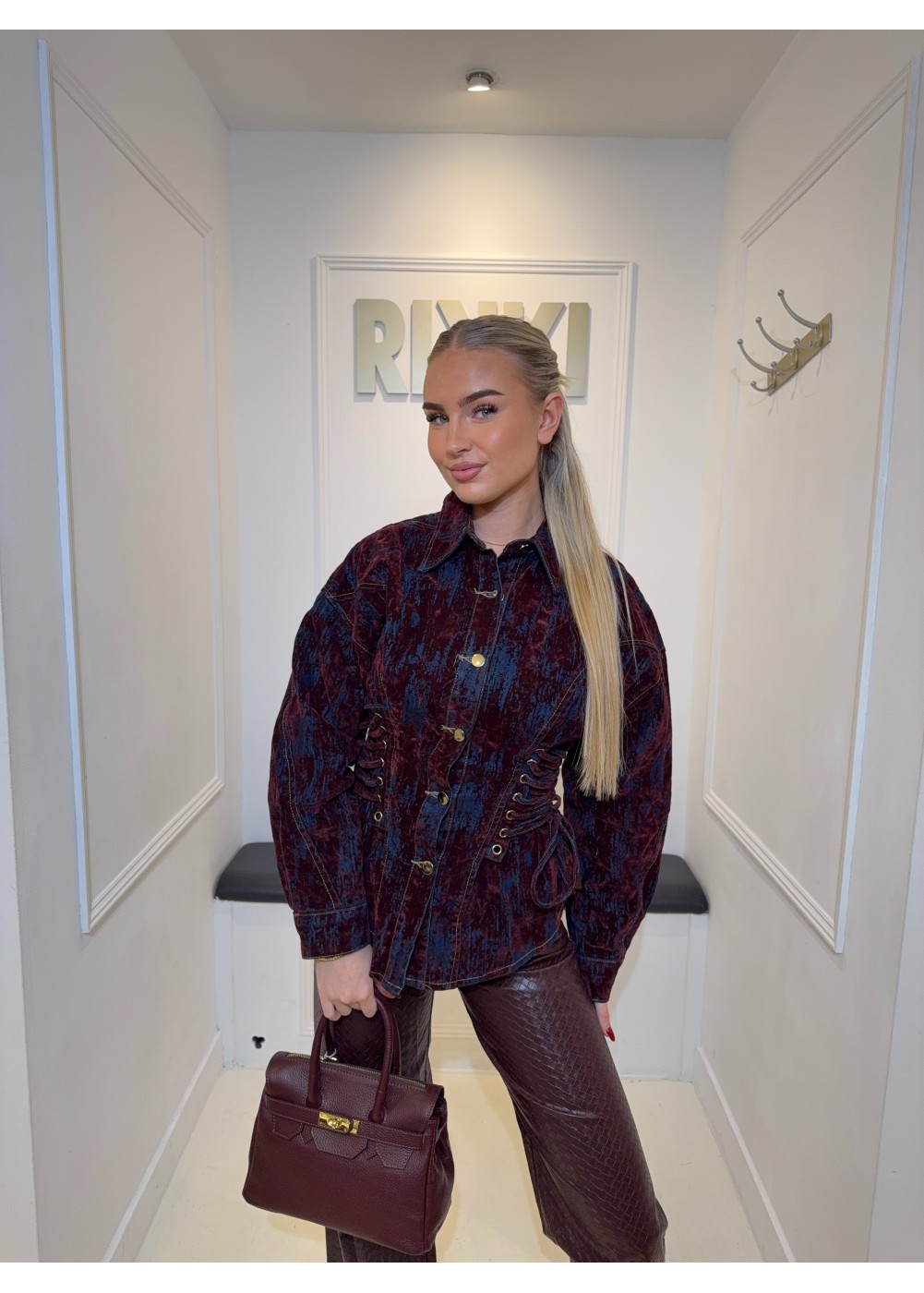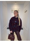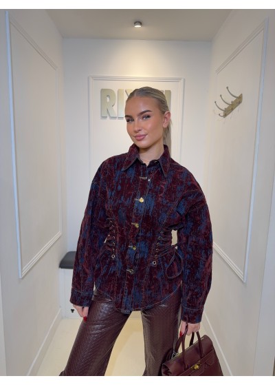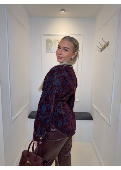 De blouse is gedetailleerd met velvet stukken.