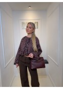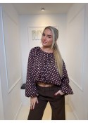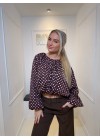 De blouse heeft lange mouwen en een strik aan de bovenkant.