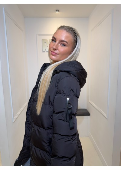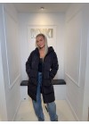 Deze gewatteerde damesjas heeft een capuchon met elastische trekkoorden, een tweewegritssluiting,