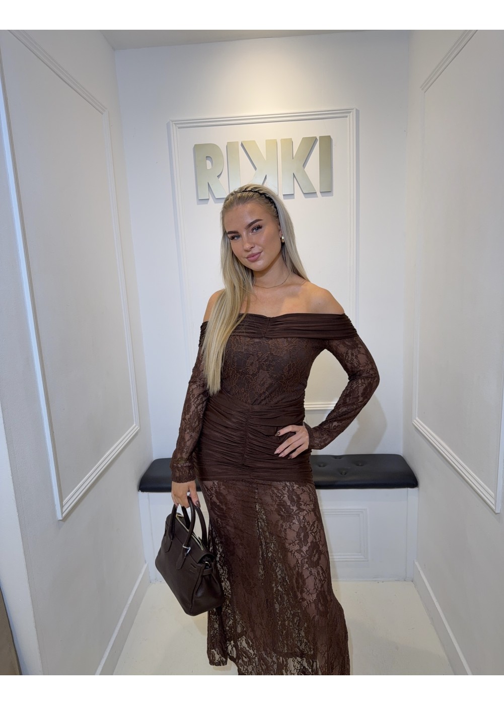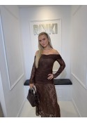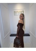 De jurk is strapless met elastiek aan de bovenkant en heeft lange doorschijnende mouwen.