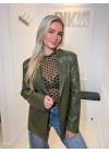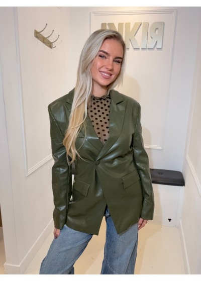De blazer is gedetailleerd met een kraag, schoudervulling en lange mouwen.
