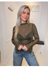 De top heeft een hogere hals en lange wijd uitlopende mouwen.