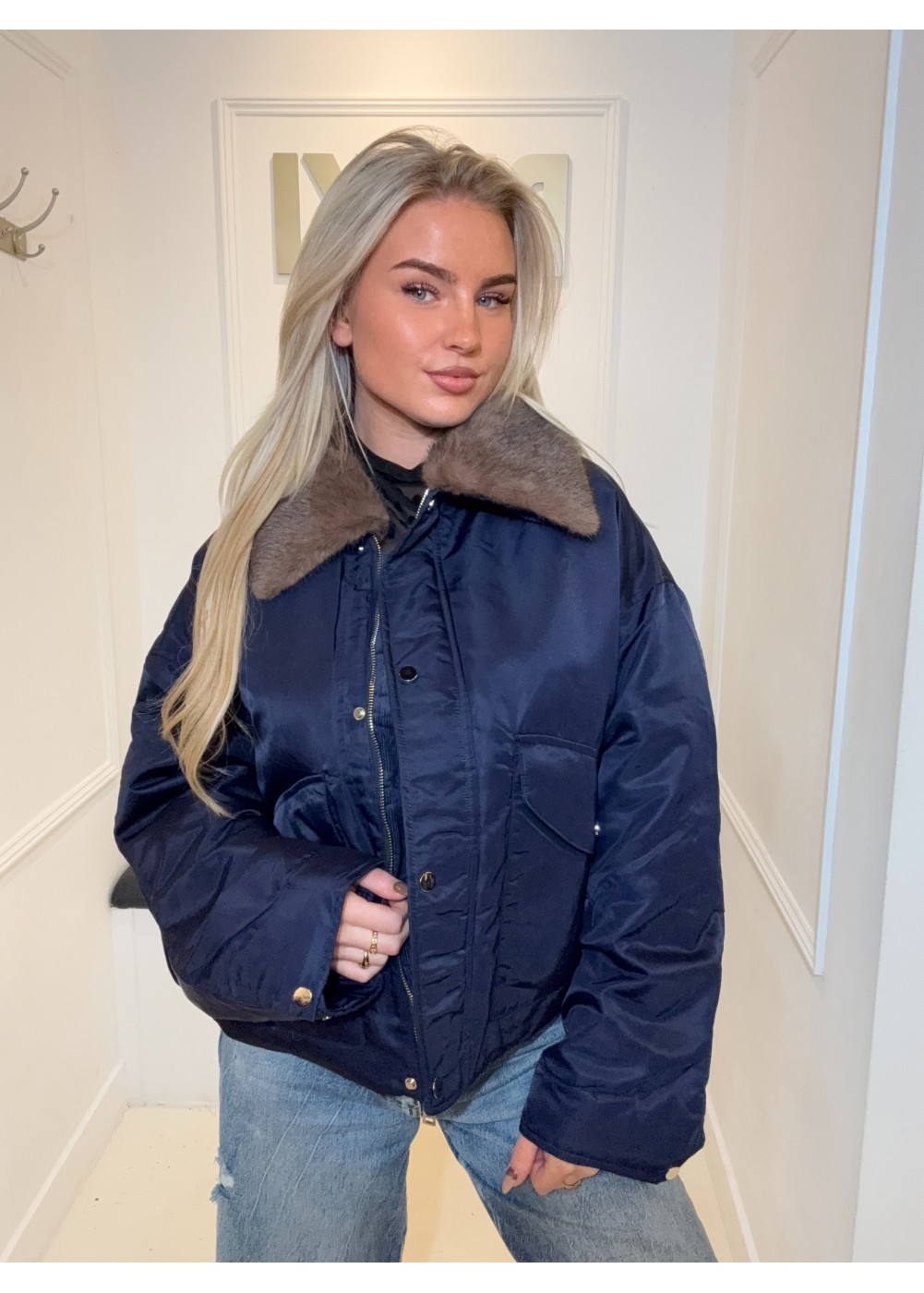 Aan de onderkant zit een aanreigkoord, daarmee krijgt de jas een poffende look