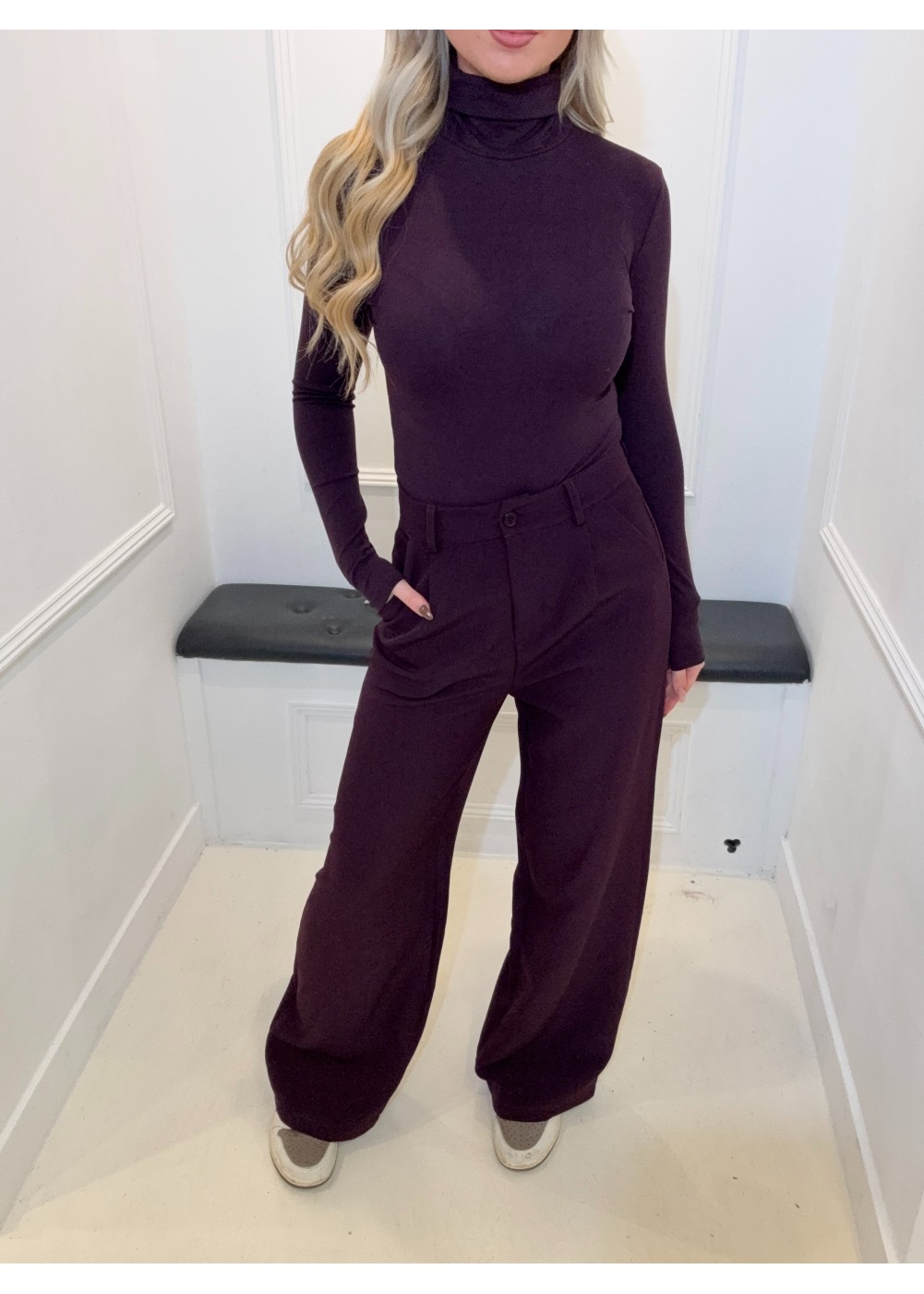 De broek heeft riemlussen, steekzakken en wijde pijpen.