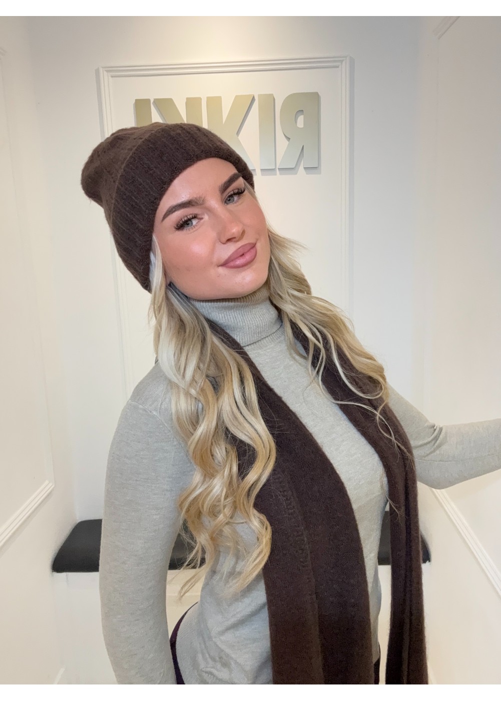 Het 2-delig set bestaat uit een beanie en een sjaal.