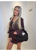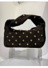 De tas heeft een rechthoekige vorm van suede en gouden studs.