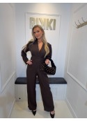 Het jumpsuit heeft een V-hals, schoudervulling en lange mouwen.