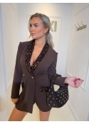 De playsuit heeft een kraag met glitter pailletten, een V-hals, schoudervulling en lange mouwen.