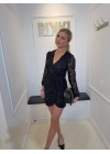 Het jurkje heeft een V-hals en lange doorschijnende mouwen met elastiek.