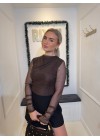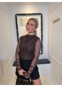 Gedetailleerd met mesh en glitters waardoor de top bij de armen doorschijnt.