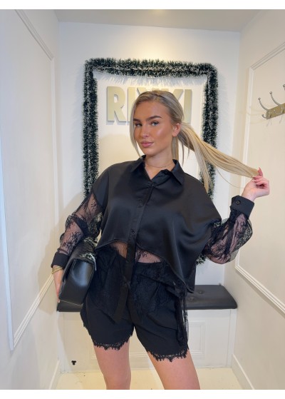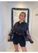 De blouse heeft een kraag en lange doorschijnende mouwen met kant.