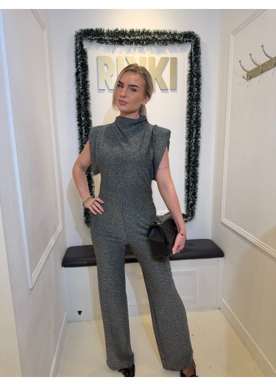 Het jumpsuit heeft een hoge hals, schoudervulling en korte mouwen.
