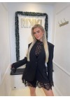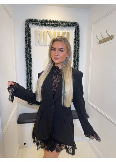 De blazer heeft lange mouwen, een kraag en neppe zakken.