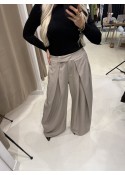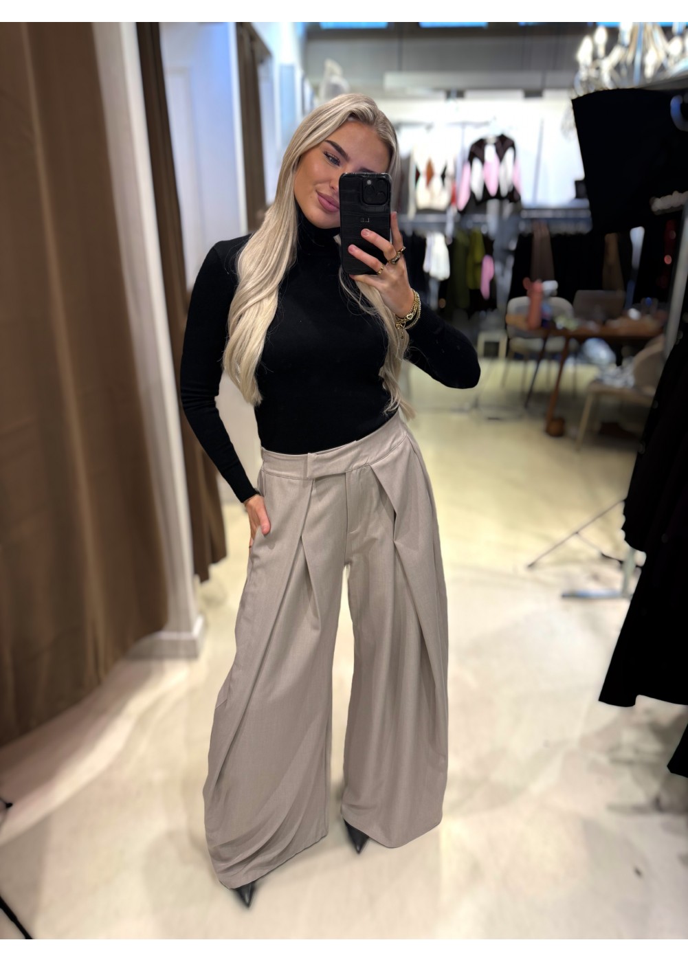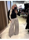 De broek heeft lange wijde pijpen, elastieke tailleband aan de