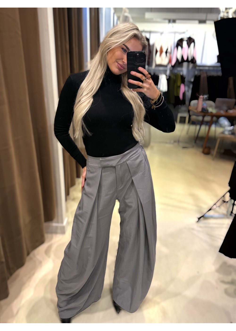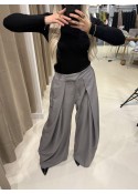 De broek heeft lange wijde pijpen, elastieke tailleband aan de