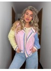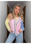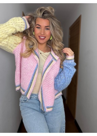 Het vest heeft een ronde hals, lange mouwen en een kleurrijke print.