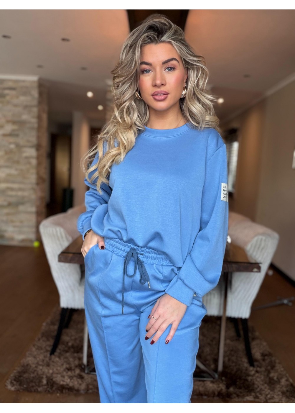 De jogger heeft steekzakken. wijde pijpen en een elastieke tailleband met een aanrijg koord.