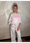 De jogger heeft steekzakken. wijde pijpen en een elastieke tailleband met een aanrijg koord.