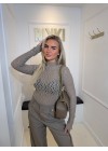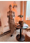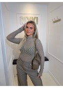 De top heeft een hogere hals en lange wijd uitlopende mouwen.