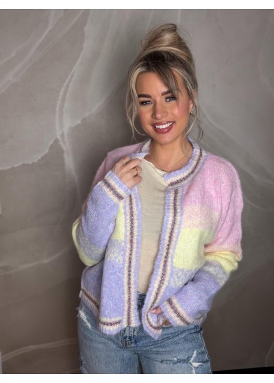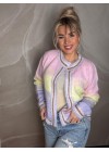 Het vest heeft een ronde hals, lange mouwen en een kleurrijke print.