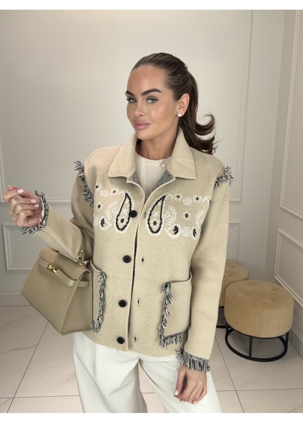 Het vest heeft een kraag, lange mouwen en opgestikte zakken.