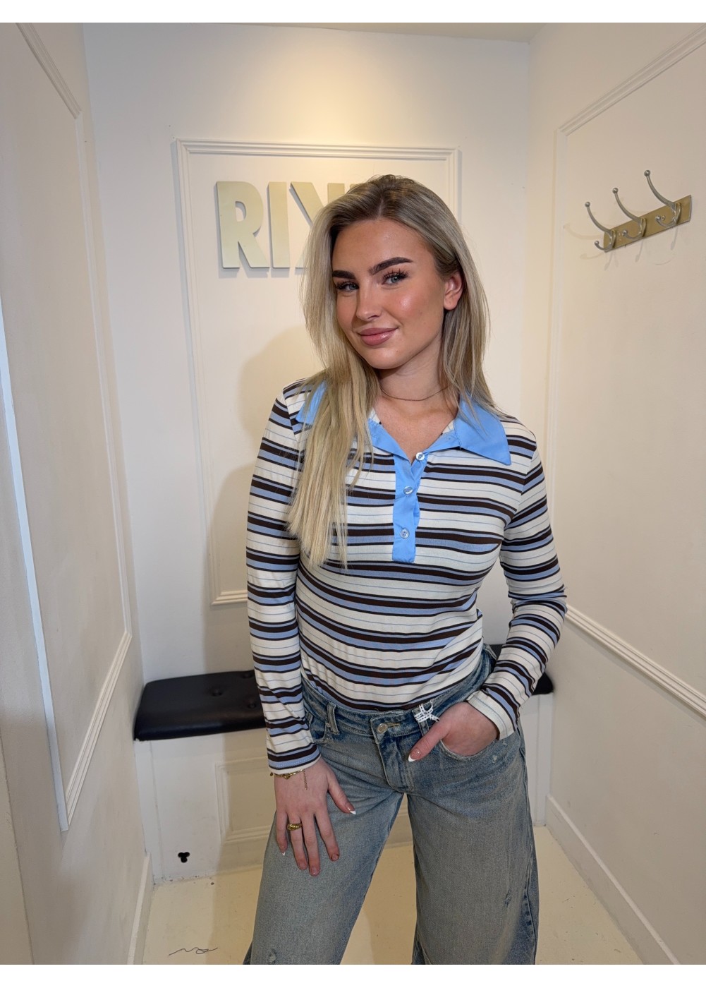 De body heeft een kraag en lange mouwen.