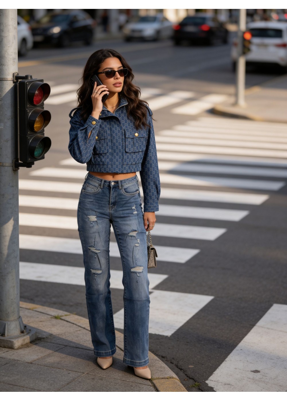 Het jasje heeft een kraagje, lange mouwen en zakjes.