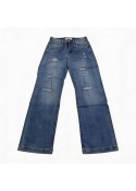 De jeans heeft damaged details.