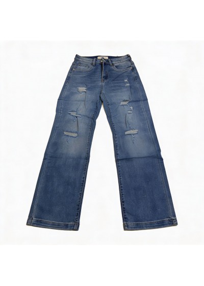 De jeans is high waist, heeft wijde pijpen en steekzakken