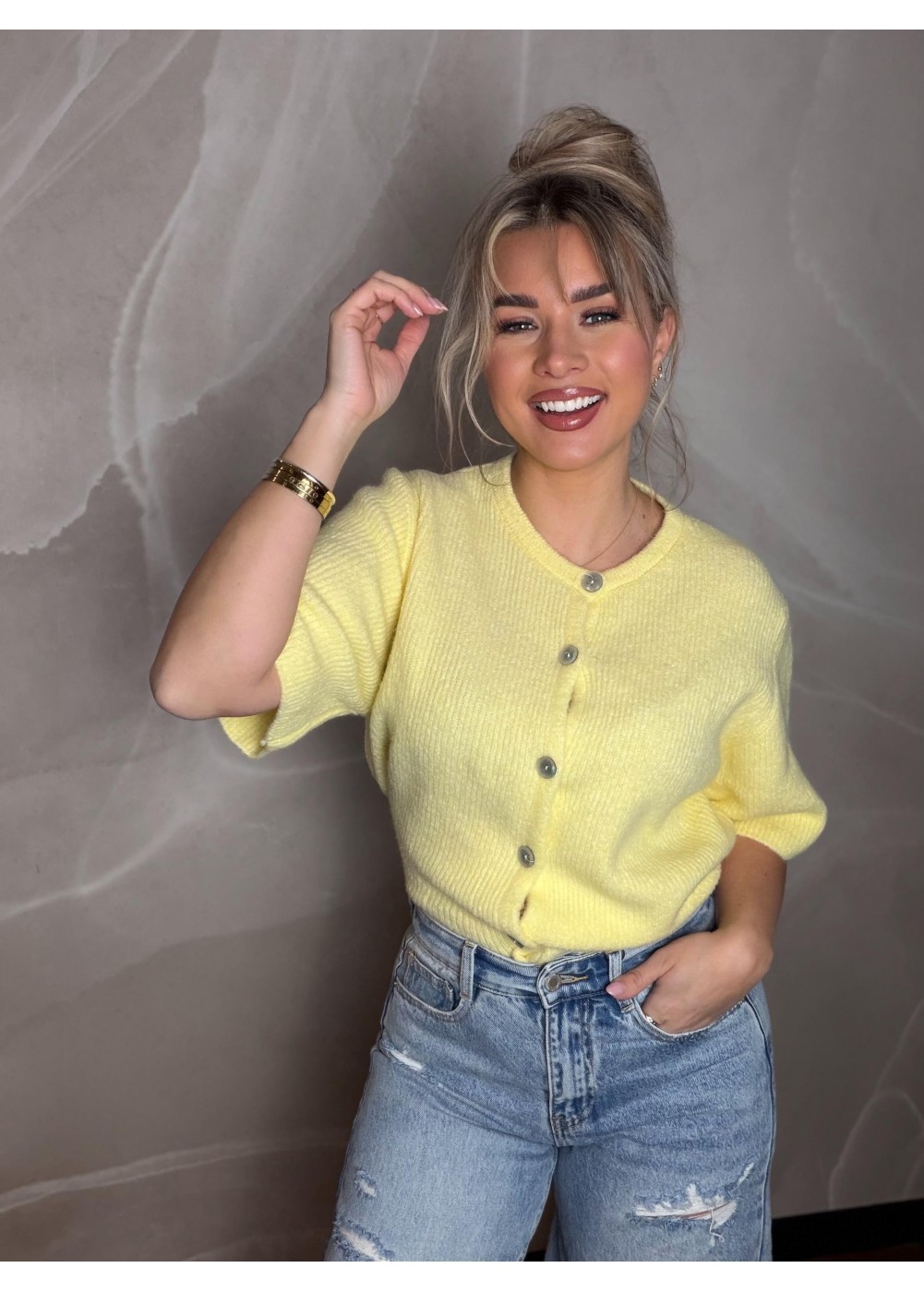 Het vestje heeft een ronde hals en driekwart mouwen.