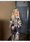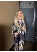 De blouse heeft een kraag en lange vleermuis mouwen met manchet.