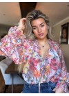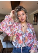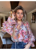 De blouse heeft lange wijd uitlopende mouwen met elastiek en een V-hals met een ruffle aan de bovenkant.