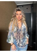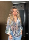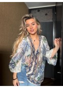 De blouse heeft lange mouwen met elastiek en een V-hals met een ruffle aan de bovenkant.
