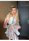 De jurk heeft een kraag en lange mouwen met aanrijg touwtjes.
