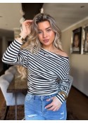 De top is off shoulder en heeft lange mouwen.