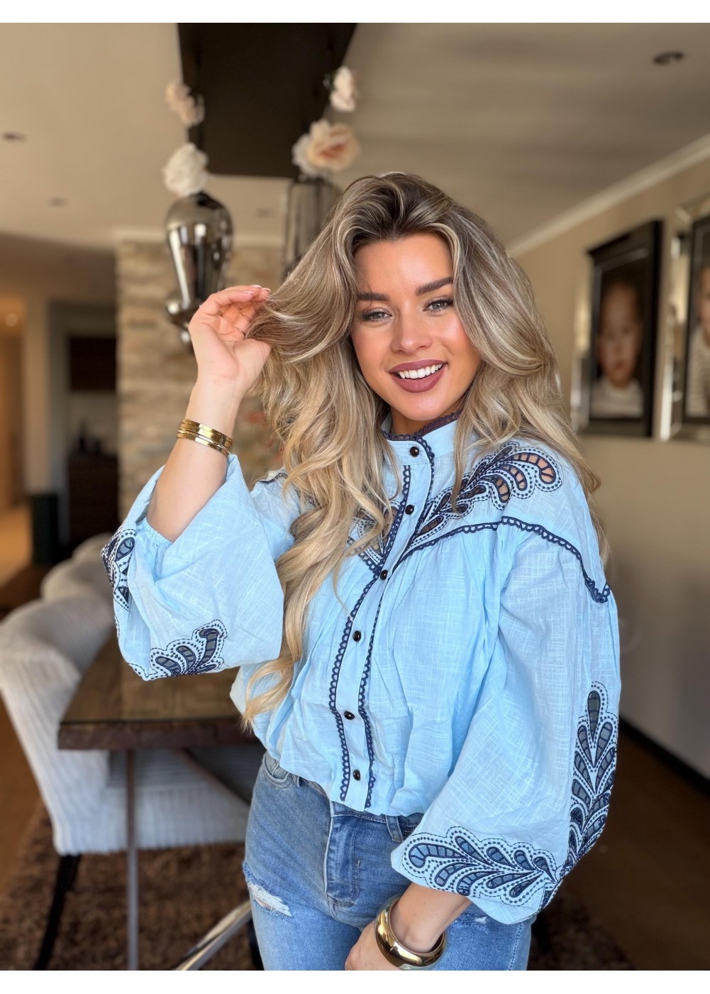 De blouse heeft lange pof mouwen en een ronde hals