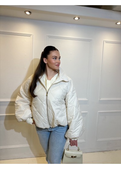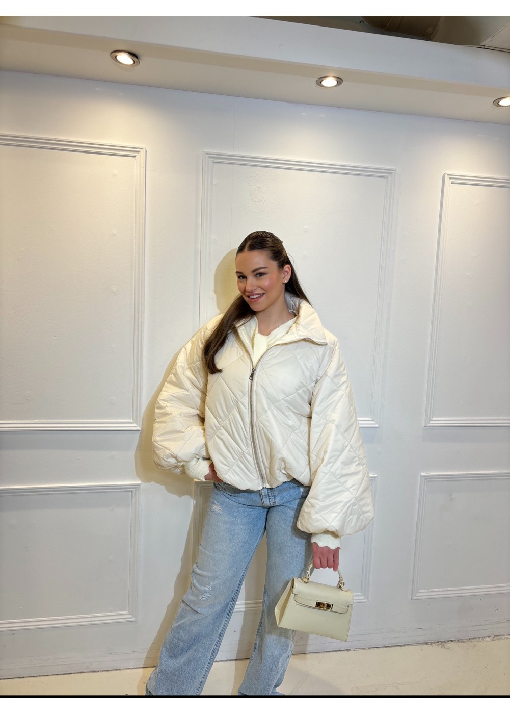 Gedetailleerd met elastiek aan de onderkant waardoor het jasje gepoft valt.