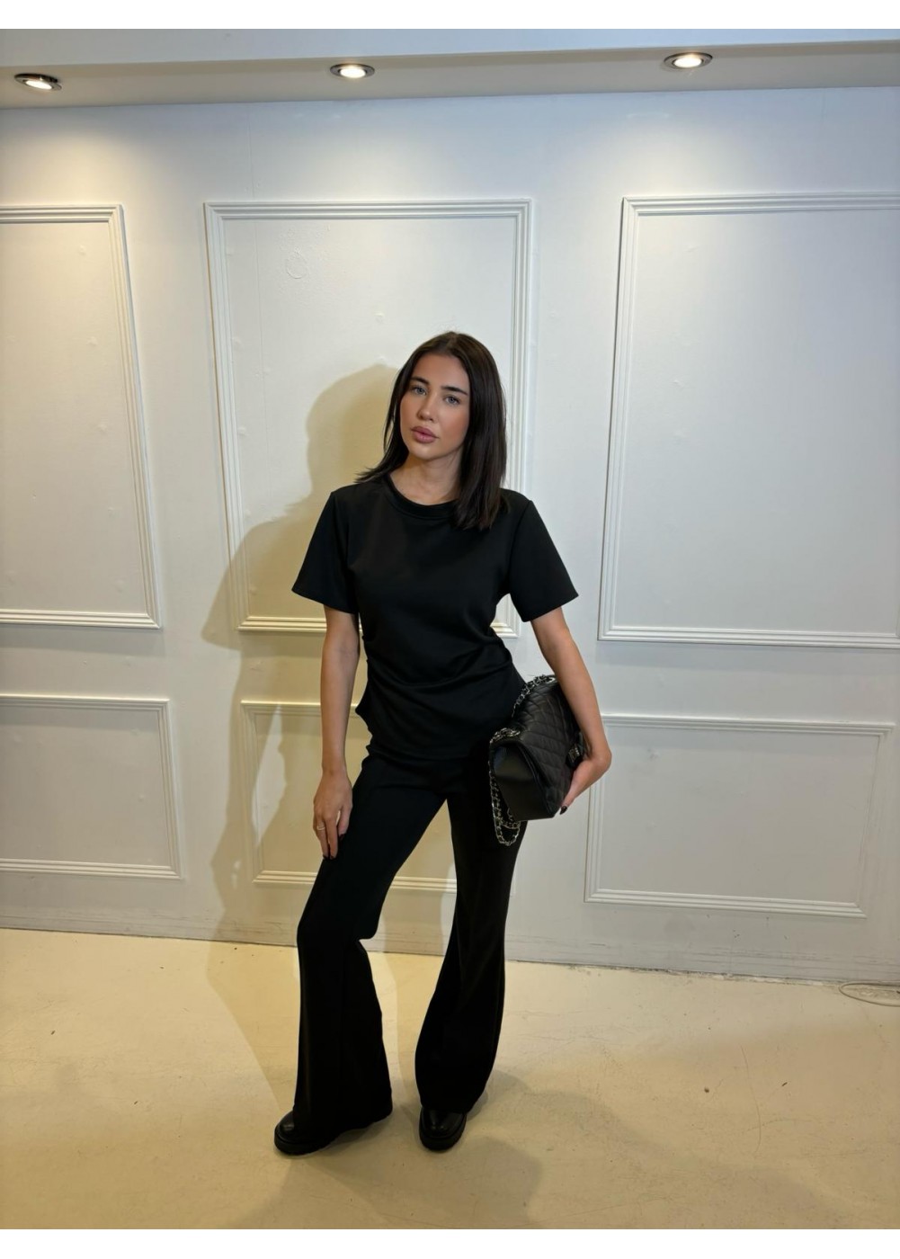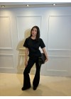 De broek heeft een elastieke tailleband aan de achterkant en een flair pijp.