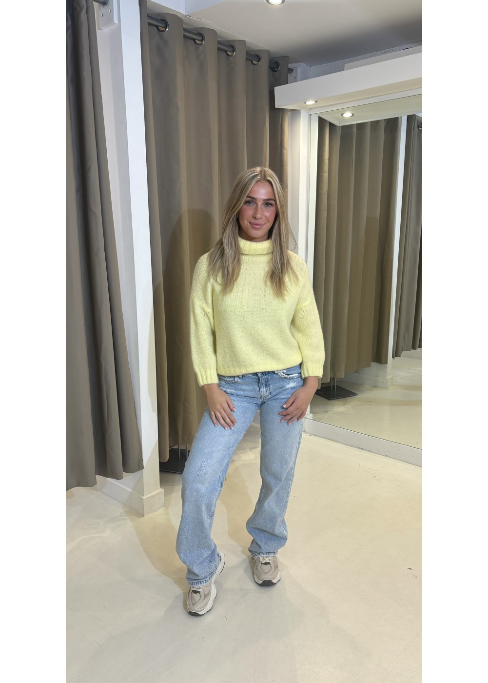 De jeans heeft een low waist en een straight fit.