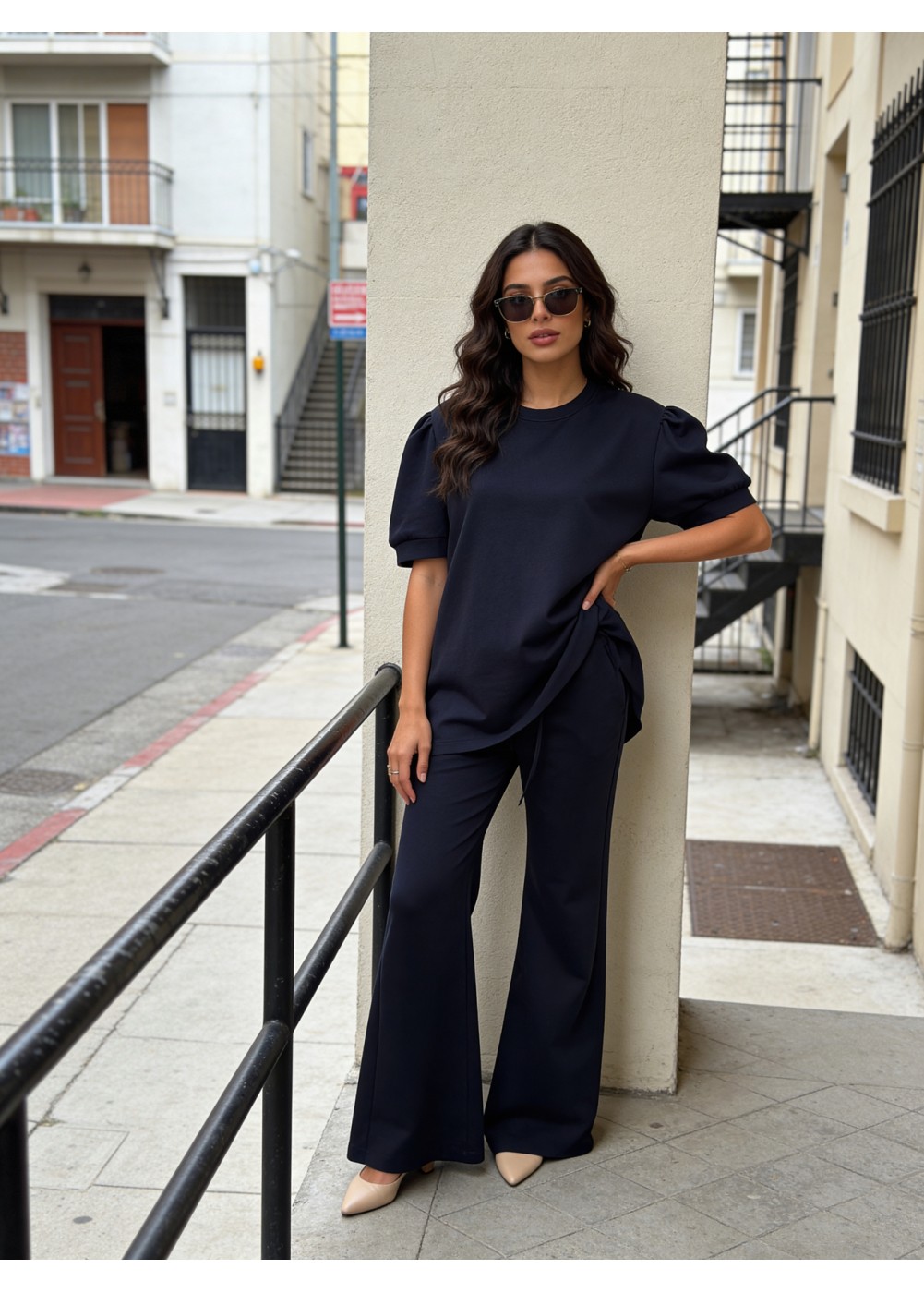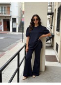 Deze set bestaat uit een top met korte pofmouwen en een flair broek met een mooie aangesloten pasvorm. De combinatie van de vrouwelijke pofmouwen en de trendy flair broek zorgt voor een stijlvolle en moderne look. Perfect voor een dagje uit, een lunchdate of wanneer je comfortabel maar fashionable gekleed wilt zijn.